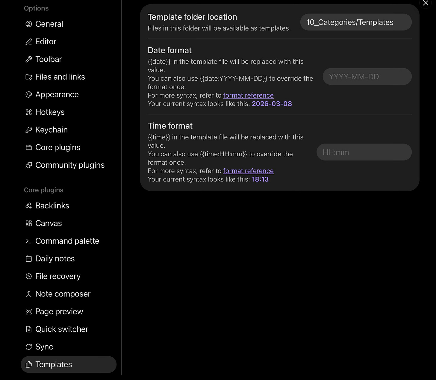 -path:"10_Categories/Templates"in the graph view to hide the templates folder from it in order to prevent unnecessary clutter.